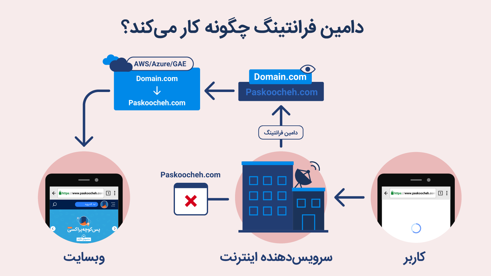 این روش و قابلیت دامین فرانتینگ نامیده میشود و فقط محدود به گوگل نیست، بلکه در حال حاضر سرویسهای بزرگ دیگری چون آمازون و مایکروسافت هم دامین فرانتینگ را فعال کردهاند. نکتهی مهم این است که این شرکتها، سرورهای ابری برای ارائه به عموم هم دارند. در واقع اگر یک اپلیکیشن از سرورهای گوگل و یا آمازون استفاده کند، این امکان را دارد که علاوه بر اتصال به آدرس خود، در ظاهر به آدرس گوگل هم متصل شود و پس از برقراری اتصالِ رمزگذاری شده، اطلاعات سایت خود را فراخوانی کند.