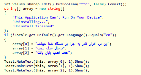 بعد از نصبِ بدافزار روی دستگاه و گرفتن دسترسیهای لازم، اپلیکیشن پیامی (انگلیسی یا فارسی با توجه به تنظیمات زبان دستگاهِ کاربر) مبنی بر اینکه «برنامه بر روی دستگاه قابل اجرا نیست»، به کاربر نشان میدهد و در ظاهر خود را از روی دستگاه حذف میکند و حتی علامت این اپلیکیشن هم از روی دستگاه حذف میشود. در این زمان هکرها از طرف اپلیکیشن پیامی مبنی بر اینکه دستگاهِ قربانی به لیست دستگاههای تحت نظارت اضافه شده، دریافت میکنند.