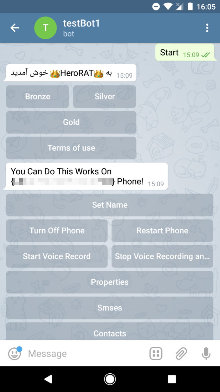 محققان شرکت ایست (ESET) اخیرا خانوادهای از بدافزارهای اندروید با قابلیت کنترل از راه دور را پیدا کردهاند. این بدافزار از پروتکل تلگرام برای ارتباط با کنترل کنندهی مرکزی خود استفاده میکند و به نظر میرسد قبل از مرداد ۱۳۹۶ شروع به پخش شدن کرده است. در اسفند ۱۳۹۶ کد این بدافزار در کانالهای هکری در تلگرام پخش شده و منجر به ساخته شدن و شیوع صدها نسخهی متفاوت از این نوع بدافزار شده است. با وجود در دسترس بودنِ منبعِ کد این بدافزار یک نسخهی پولی از آن به نام HeroRAT در برخی کانالهای خصوصی بر اساس قابلیتهای مختلف و سطوحِ مختلف پشتیبانی به قیمتهای متفاوت برای فروش عرضه شد.