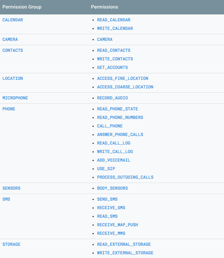 به گفتهی صفحهی گوگل دولوپر (Google Developer) دسترسیهای خطرناک شامل آنهایی است که اَپها با استفاده از آن امکان جمعآوری و ذخیرهی دادههای شخصی کاربران را پیدا میکنند. این دسترسیهای خطرناک به شکل زیر گروه بندی میشوند: