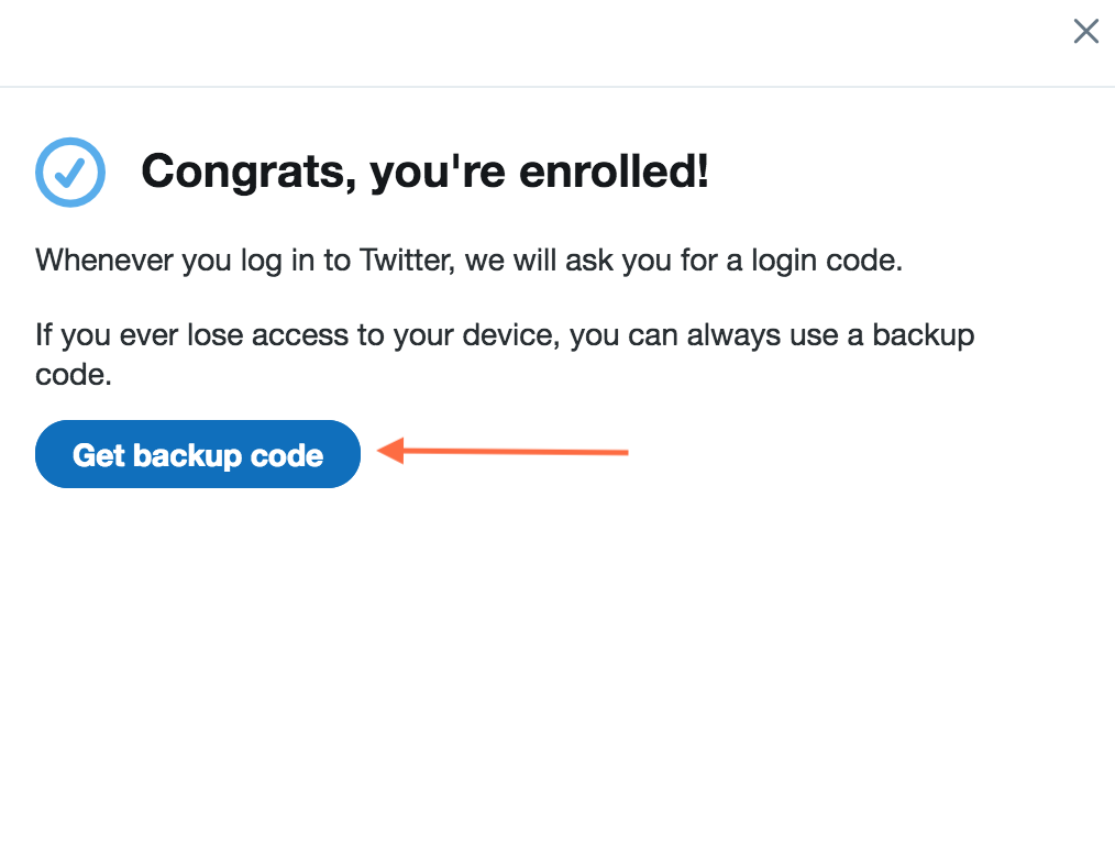 ۲.۳.۲- پس از وارد کردن این کد ۶ رقمی، تایید هویت دو مرحلهای از طریق پیامک برای حساب کاربری توییتر شما فعال شده است. در این مرحله روی دکمهی Get backup code کلیک کنید و کد پشتیبان را برای مواقع ضروری ایجاد کنید.