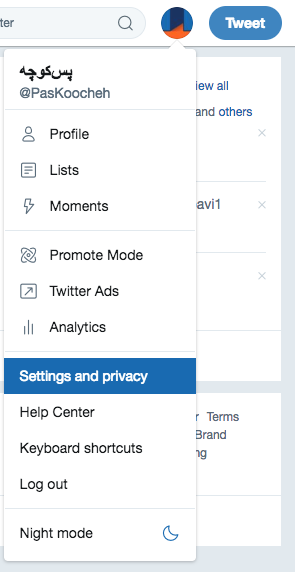 ۱- از طریق مرورگر خود وارد حساب توییتر شوید. در بالای صفحه و در فهرست برنامهی توییتر، گزینهی Settings and Privacy را انتخاب کنید.