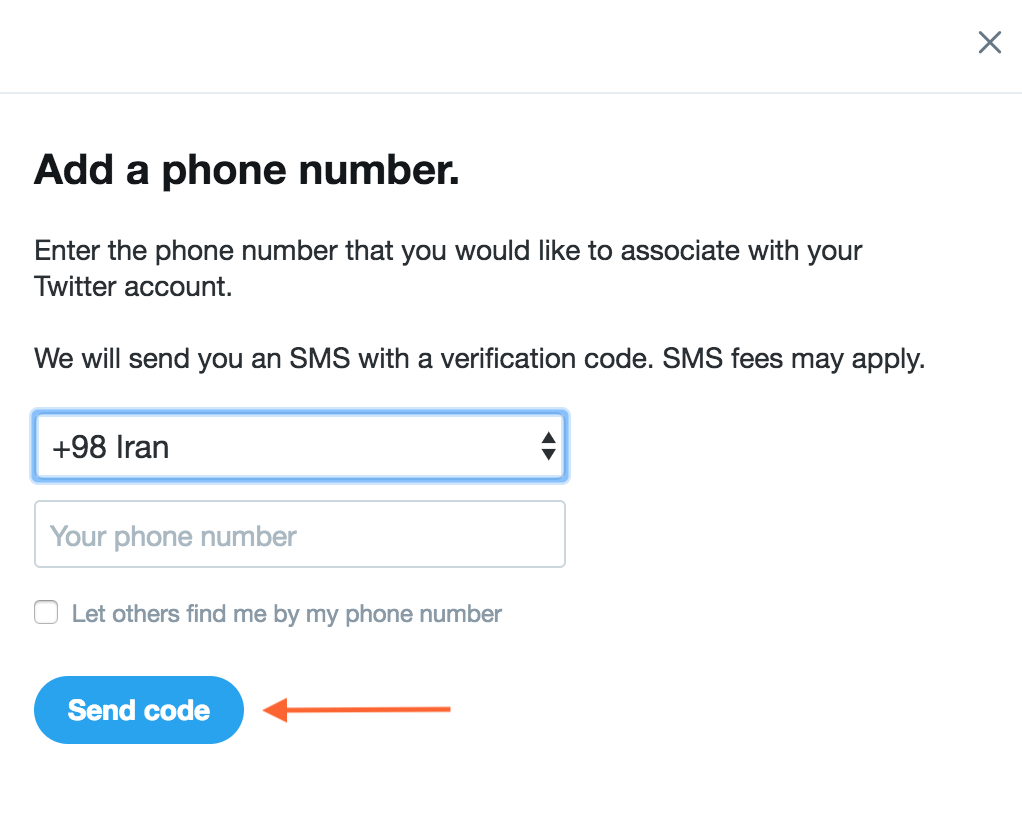 ۲.۳- در این مرحله شمارهی تلفنِ موبایلی که قادر به دریافت پیامک (SMS) است را وارد کنید. سپس دکمهی Send code را انتخاب کنید تا کد ۶ رقمی از طرف توییتر برای شما فرستاده شود.