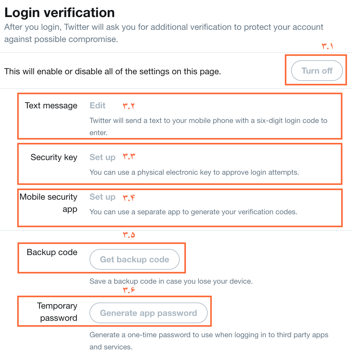 ۳.۱- با انتخابِ دکمهی Turn Off در واقع دریافت کد تایید هویت دو مرحلهای را فعال یا غیر فعال میکنید.