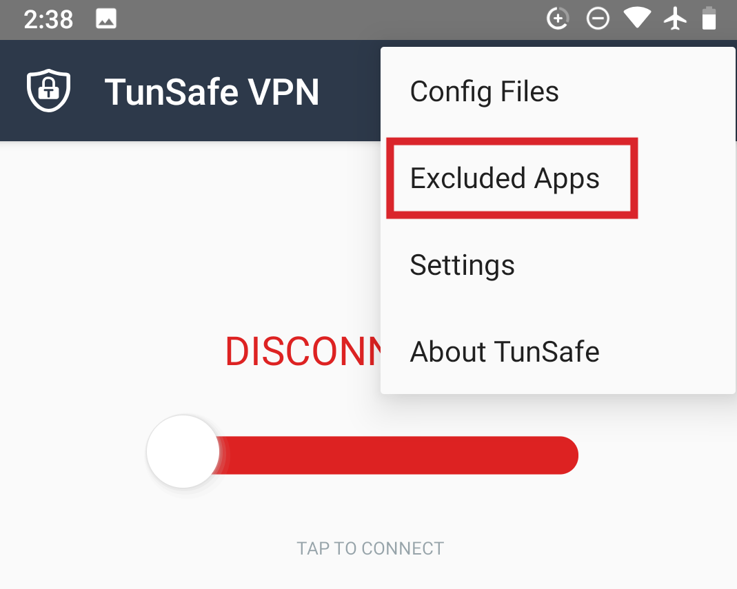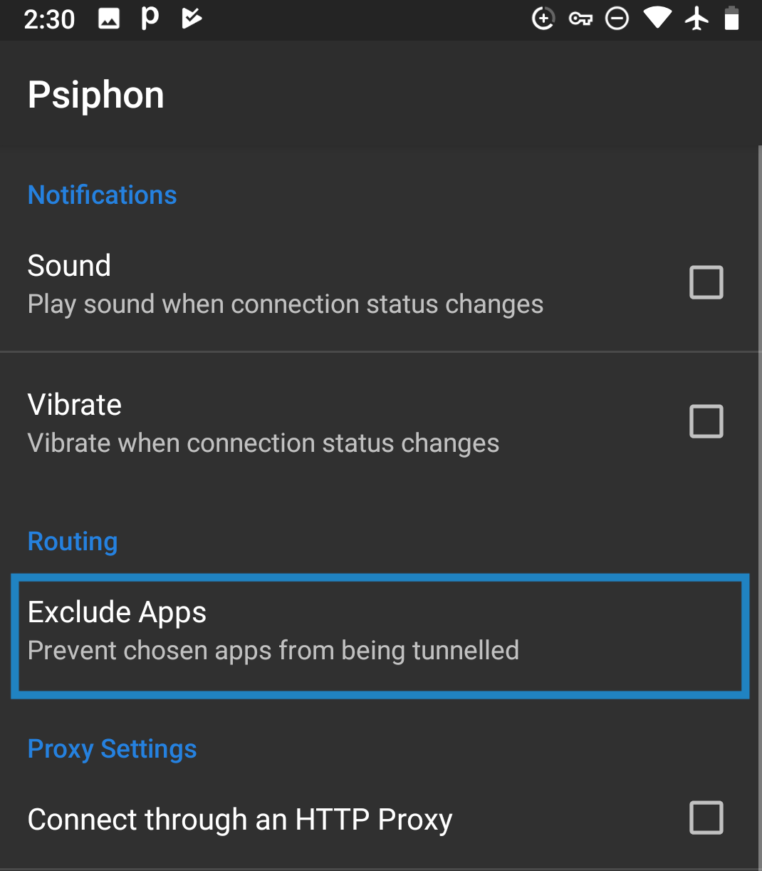 ۳ - برای قطع دسترسی اپلیکیشنهایی که نیازی به استفاده از فیلترشکن سایفون ندارند، گزینه Exclude Apps را انتخاب کنید.
