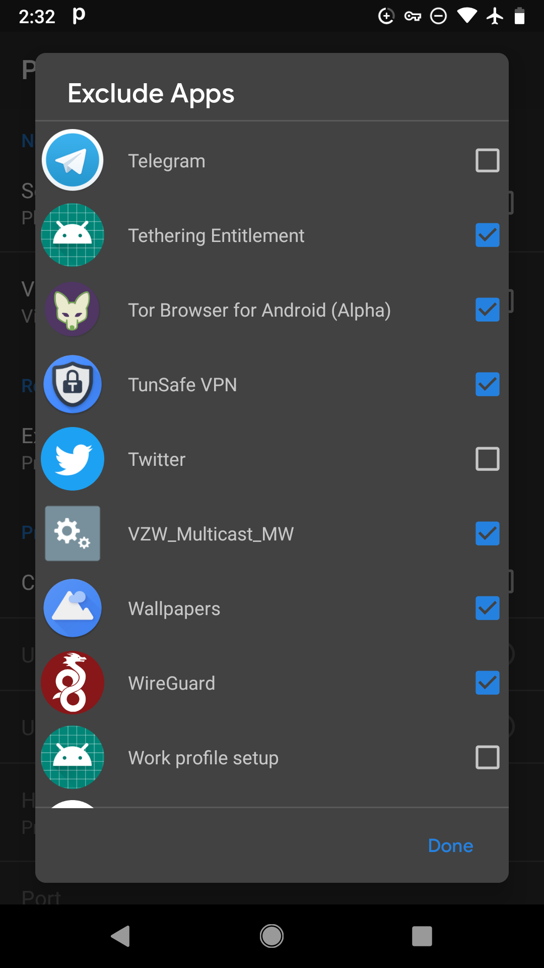 ۳ - اپلیکیشنهایی که مایل نیستید از تونل Tunsafe عبور کنند را با کلیک کردن انتخاب کنید. در این تصویر، تنها اپ توییتر و تلگرام برای عبور TunSafe انتخاب شدهاند.