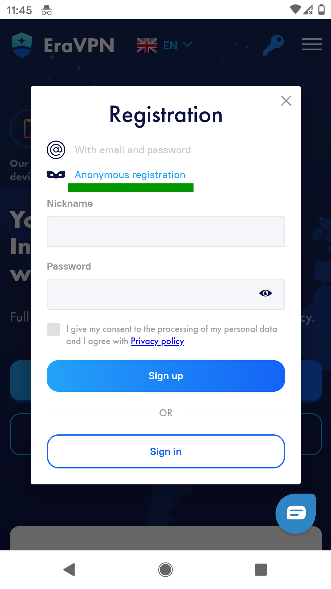بر اساس تجربهی ما انتخاب راه دوم -استفاده از اسم مستعار- زمان کمتری را برای ساختن حساب کاربری از شما میگیرد. چون نیازی به تایید هویت شما وجود ندارد و شما را خیلی سریع به رابط کاربری یا داشبورد برنامه انتقال میدهد. پس برای ساخت حساب کاربری به صورت ناشناس، گزینهی Anonymous registration را انتخاب کنید. در قسمت Nickname یک نام کاربری مستعار و در قسمت password یک رمز عبور برای خود انتخاب کنید.