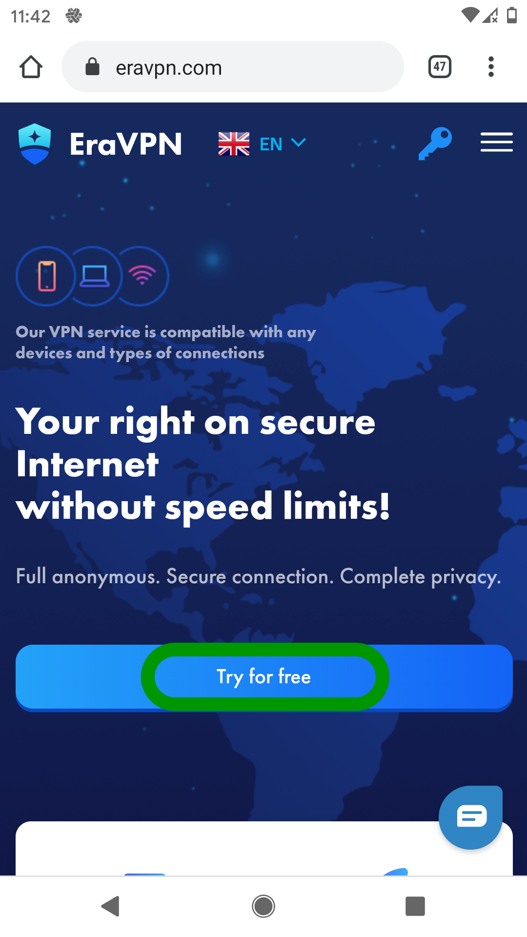 ۱. در ابتدا برای ساختن حساب کاربری به وبسایت https://eravpn.com/ بروید و از صفحهی اصلی همچون تصویر زیر، بر روی دکمهی Try For Free کلیک کنید.