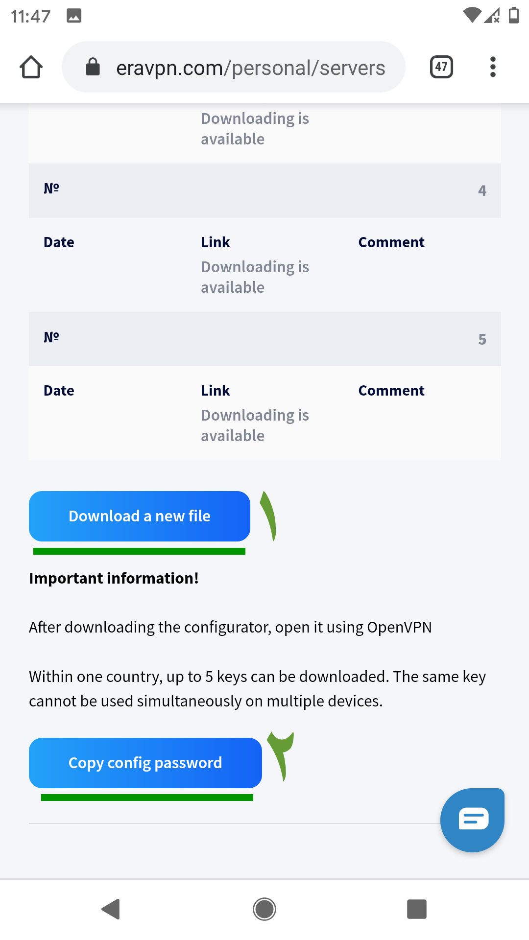 ۱- با کلیک بر دکمهی Download a new file، دکمهی Download a OpenVPN file را بزنید و فایل پیکربندی را دانلود کنید.