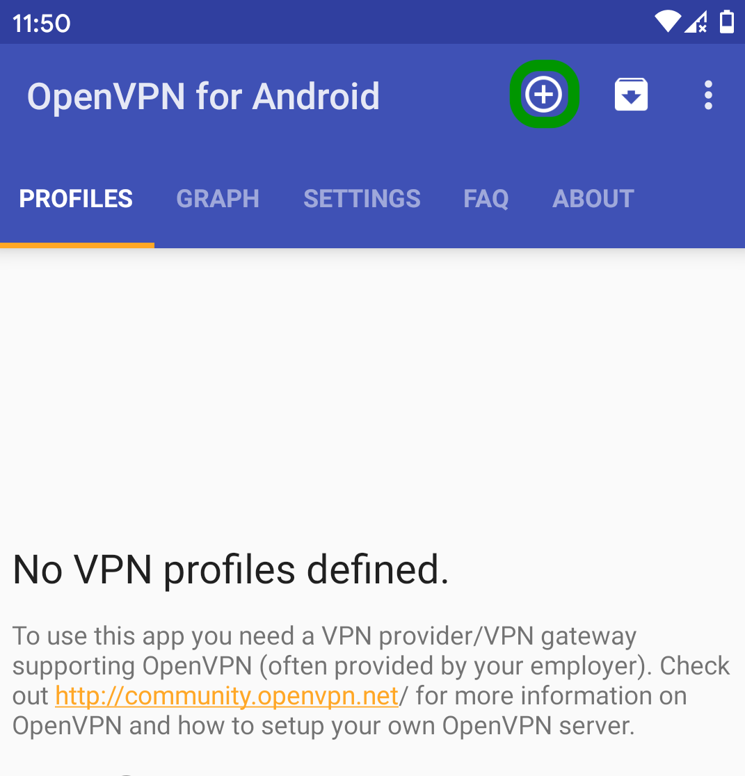 ۱. اپلیکیشن OpenVPN را باز کنید و برای وارد کردن فایل کانفیگ روی علامت + کلیک کنید.