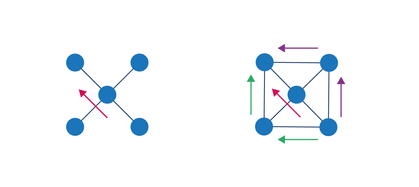 در شبکههای مش، بسیاری از گرهها میتوانند به بسیاری از گرههای دیگر وصل شوند. در طرحهای سنتی اما یک گره ممکن است به یک یا چند گره متصل شود.