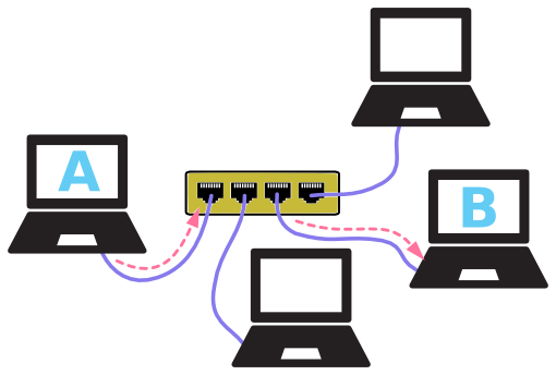 با استفاده از سوئیچ، کامپیوتر A پیامی را به کامپیوتر B میفرستد - سایر کامپیوترها این پیام را نمیبینند. آن کامپیوترها میتوانند پیامهای دیگر را به طور همزمان و بدون دخالت ارسال کنند.
