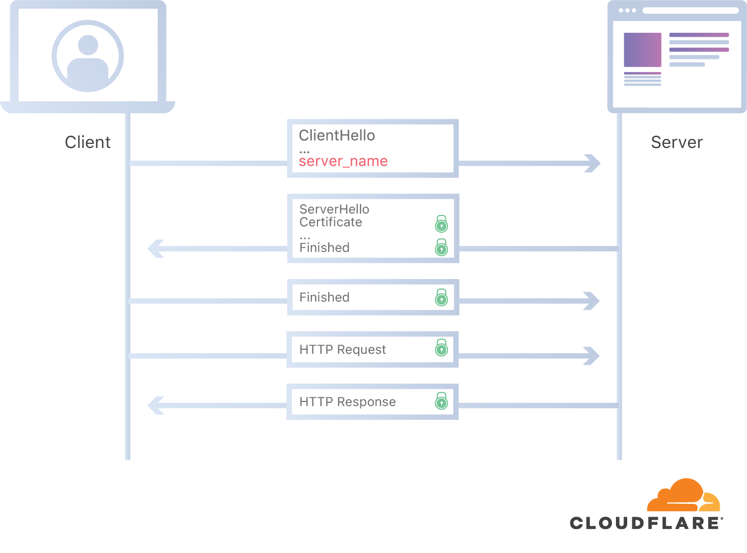 پیغام اولیه شامل چند قرارداد از جمله نسخه پروتکل، الگوریتم رمزنگاری، ... و آدرس وبسایت (server_name) مورد نظر میشود. سپس سرور میزبان با دانستن این اطلاعات گواهی مورد نظر را که SSL Certificate نام دارد برای مرورگر ارسال میکند.