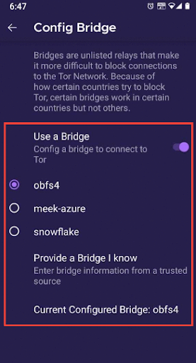 صفحه بعدی گزینهای را برای استفاده از پل داخلی یا پل سفارشی ارائه میدهد. با گزینه "Use a Bridge" سه گزینه خواهید داشت: "obfs4"، "meek-azure" و "snowflake".
