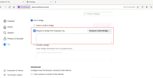 اگر که تور را در حال اجرا دارید، از منوی (≡) به بخش Preferences یا settings بروید و در نوار کنار صفحه روی tor کلیک کنید. در قسمت "Bridges" قسمت "Use a Bridge" را انتخاب کنید و گزینه "Request a Bridge from torproject.org" را انتخاب کنید و روی "Request a New Bridge..." کلیک کنید تا یک پل به شما داده شود. سپس روی "Submit" کلیک کنید. تنظیمات شما پس از بستن صفحه، بهطور خودکار ذخیره می شود.