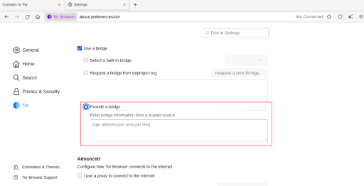 اگر برای اولین بار است که مرورگر Tor را راهاندازی میکنید، روی "Tor Network Settings" کلیک کنید تا پنجره تنظیمات Tor باز شود. در بخش «Bridges»، کادر «Use a bridge» را انتخاب کنید، سپس «Provide a bridge I know» را انتخاب کنید و آدرس هر پل را در یک خط جداگانه وارد کنید. برای ذخیره تنظیمات روی "Connect" کلیک کنید. اگر مرورگر Tor در حال اجرا است، از منوی (≡) روی «Preferences»یا settings کیک کنید و سپس روی «Tor» در نوار کناری کلیک کنید. در قسمت “Bridges” بخش “Use a Bridge” را انتخاب کنید و از گزینه “Provide a Bridge I know” آدرس هر پل را در یک خط جداگانه وارد کنید. محدودیتی برای تعداد پلها وجود ندارد. هرچه تعداد این پلها بیشتر باشد, امکان اتصال به شبکه از طریق آنها بیشتر خواهد شد. پس از بستن برگه، تنظیمات شما به طور خودکار ذخیره می شود.