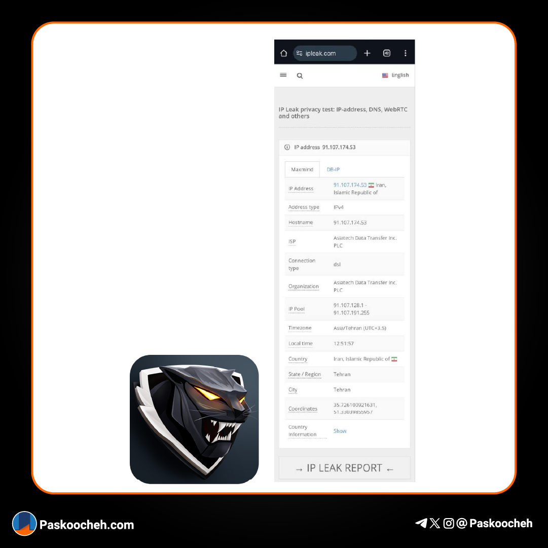 تیم پسکوچه در زمان بررسی این ویپیان و تست نشت IP به موردی برخورد که آیپی و موقعیت ایران نمایش داده میشد. نمونه بررسی در تصویر زیر قابل مشاهده است. این موضوع نیاز به تحقیقات بیشتر فنی دارد.