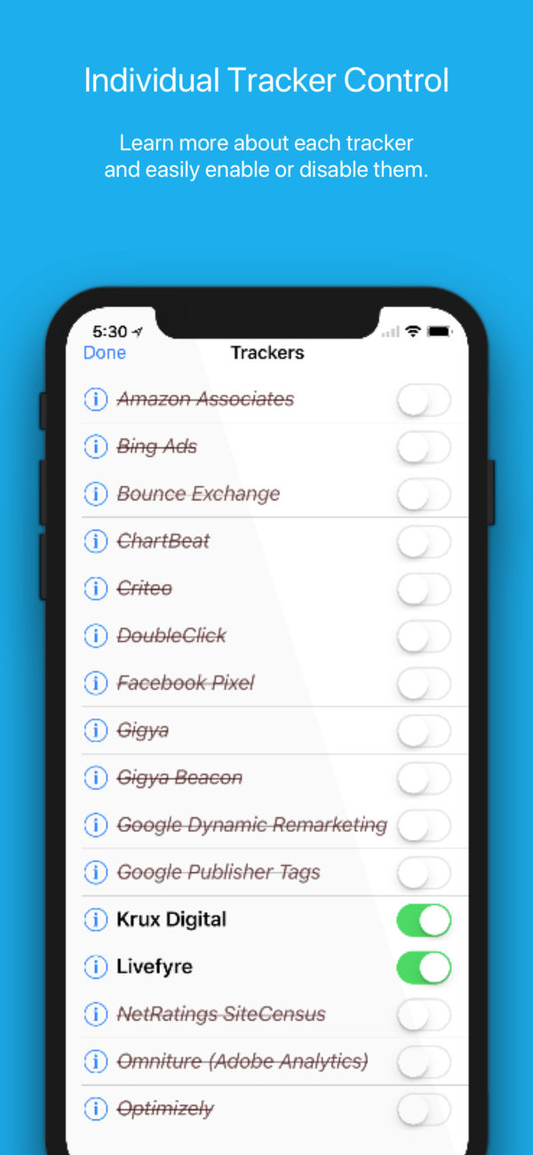 یک نمای کلیِ فوری از ردیابهای سایتهای بازدید شده به شما میدهد، سپس به ردیابهای مورد نیاز اجازهی دسترسی میدهد و بقیه را مسدود میکند.